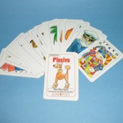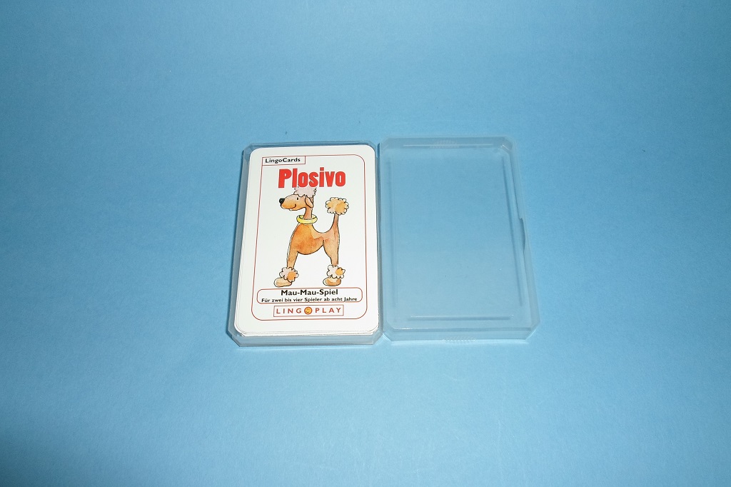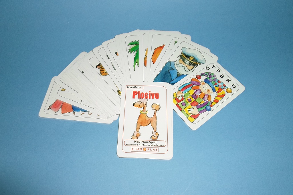 - Ablegespiel nach dem bekannten Mau-Mau-Prinzip. Es trainiert die Fähigkeit, die ähnlich klingenden Plosivlaute P und B, T und D, K und G aus den Wörtern herauszuhören und zu unterscheiden. Eine Karte kann abgelegt werden, wenn sie mindestens einen Plosiv mit der offen liegenden gemeinsam hat. Dabei können die Plosive an verschiedenen Positionen im Wort stehen. Auf den Pelikan passen die Motive Palme oder der Kürbis, auf die Trauben passt z. B. das Brot, aber auch der Gürtel. Spannung bringende Aktionskarten: Plus-2, Aussetzen und Joker. Wer nicht ablegen kann, zieht eine Karte vom Stapel. Es gewinnt der Spieler, der zuerst keine Karten mehr hat. Motive (Beispiele): Anker, Bank, Brot, Geige, Globus, Gürtel, usw.