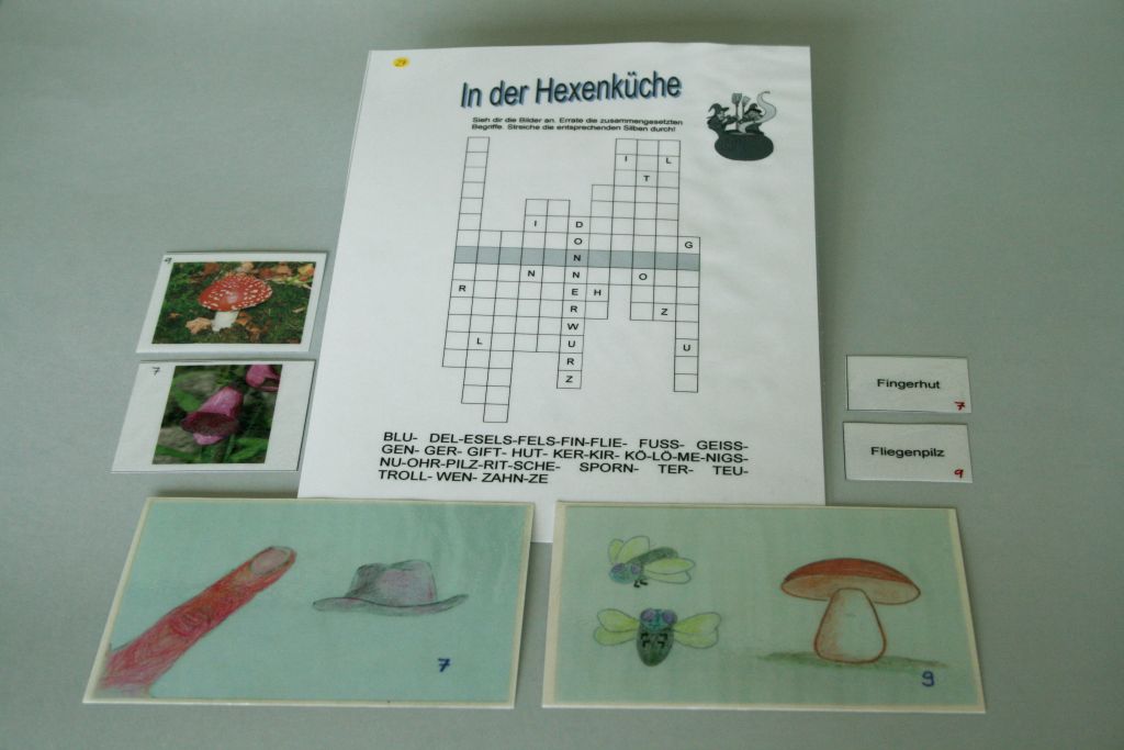 - 1 Arbeitsauftrag, 1 Hexenkreuzworträtsel, 1 Lernkontrolle, 11 Begriffskärtchen, 11 Wortkärtchen (als Kontrolle)