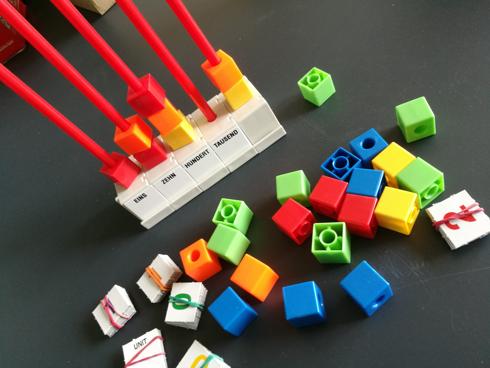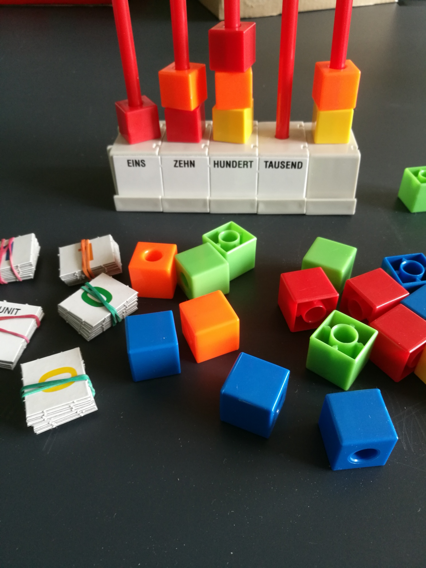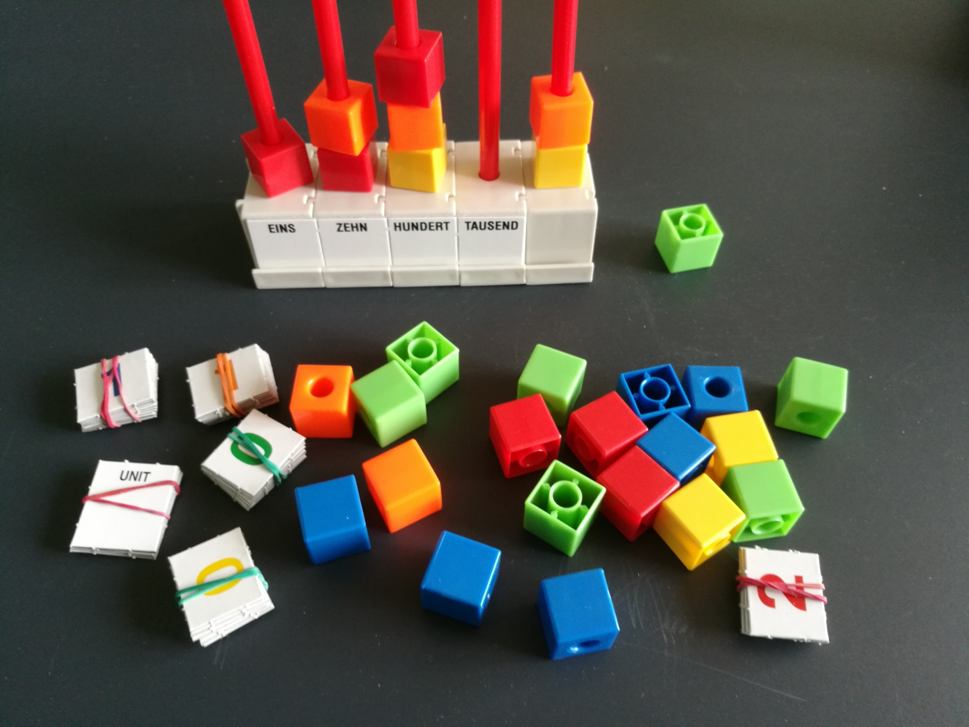 - Die Kinder lernen das Dezimalsystem durch eigenes Handeln sehr anschaulich kennen. 10 Einer werden in 1 Zehner, 10 Zehner in 1 Hunderter und 10 Hunderter in 1 Tausender umgewandelt. Der Sockel des Rechengerätes lässt sich bei der Einführung eines neuen Stellenwertes erweitern. Die Kinder erwerben schon vom ersten Schultag an Rechenfertigkeiten. Sie zählen, addieren und subtrahieren. Der Zehnerübergang wird veranschaulicht. Das Material wird in einer Stapelbox geliefert.